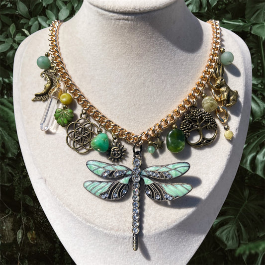 Chrysoprase, Jade + Peridot Dragonfly Charm Necklace