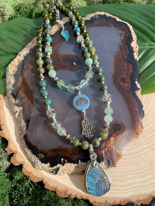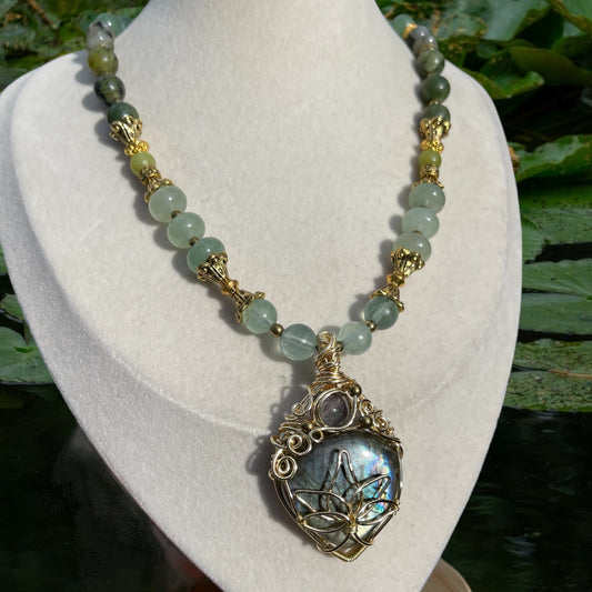 Fallyn • Labradorite, Fluorite, Jade + Mossy Agate Lotus Flower Necklace