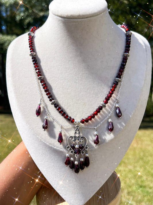 🥀 The Midnight Rose Set • Faceted Garnet Chandelier Necklace + Earrings