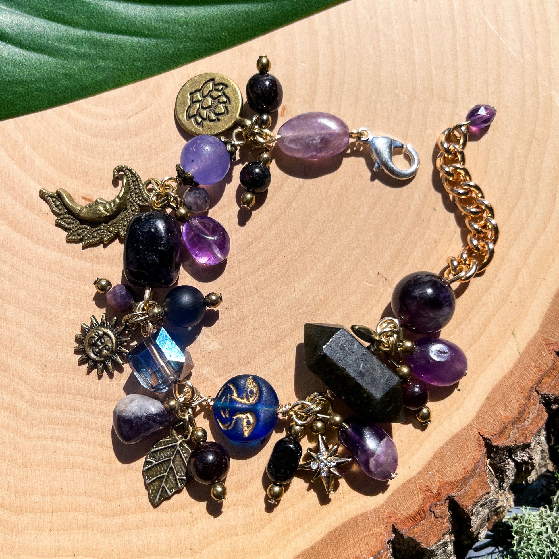 Whimsigoth Amethyst, Onyx + Smokey Quartz Charm Bracelet